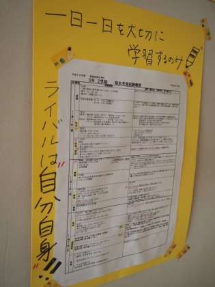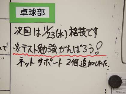 昨日で3年生の三者面談も終わり、学校全体が期末考査に向け最後の追い込みに入っています。面接を待つ控室でも寸暇を惜しんで勉強に励む3年生の姿を見て、下級生は何を思うのでしょうか。そんな船橋希望中の期末準備に励む人への応援メッセージがあちらこちらに書かれています。苦しいのはみな同じ。自分に打ち勝ち頑張れば、来週はまた晴れて部活動や放課後活動に打ち込める日々がやってきます。あと2日。悔いのないよう自分のできる精一杯の準備をしてください。