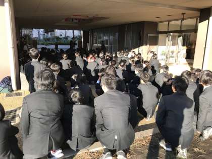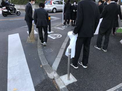 今日は二年生が学校の周りの落ち葉掃きを行なっています。増子