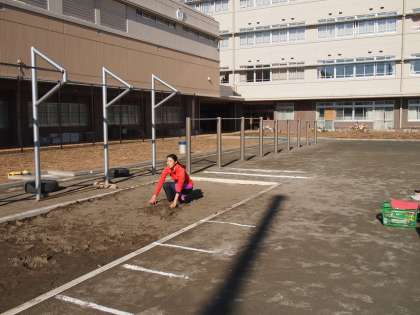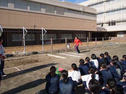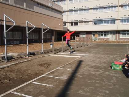 今日の体育授業は「走り幅跳び」の基礎を学びました。まずは、三歩助走をいかにリズミカルにタイミングをつかんで行うかがポイントになります。そこで、陸上跳躍を専門学んでいる大学の選手に来ていただき、見本を示していただきながらアドバイスをしていただきました。目の前で鮮やかに跳ぶ選手の姿に感動している生徒たちです。