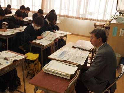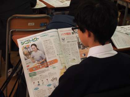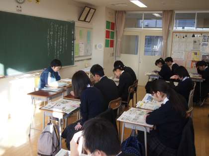 5月から始まったNIEタイム。7回目となる今日で今年を締めくくります。みんなが手にしている新聞にも「みんなで選ぶ今年の10大ニュース」の記事が掲載されていました。このNIEタイム、何といっても600人を超える船橋希望中の生徒と先生が同じ新聞を一斉に広げる時間を共有できることが何よりの魅力です。冬晴れの週末の朝、静かな教室に新聞をめくる音だけがしています。