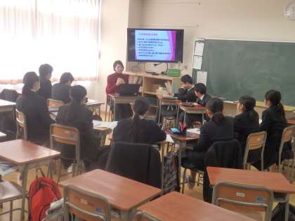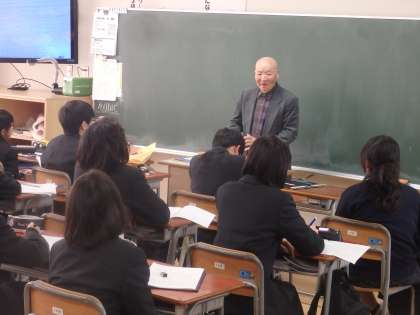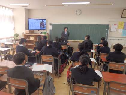 動物愛護センター、パテシエ、栄養士の方々の授業の様子です。生徒たちも真剣に話を聞いています。(田村真)