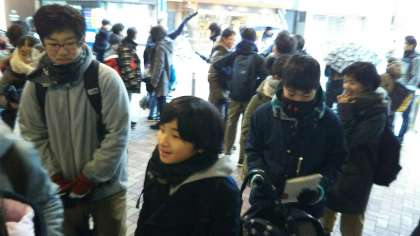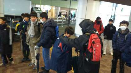 集合チェックを受けて出発します。天気が悪いので足下に気をつけて行きましょう。(田村真)