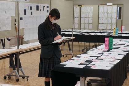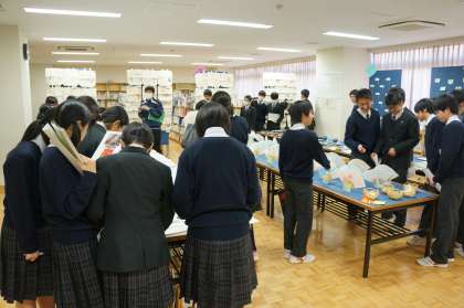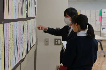 各学年の行事に関する内容などが展示されていますが、3年生はこれまでの3年間を懐かしみながら展示物を見ています。