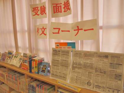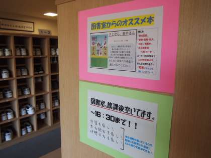 生徒の昇降口にも「図書室からのオススメ本」のポスターや、利用を促すポスターが掲示されています。また本だけでなく、受験の今の時期にちなんだ記事を中高生新聞から選んで紹介してあったり、英字新聞を置くなど、生徒たちの学校生活に少しでも役立つように創意工夫を重ねているのが、今のフナキボ図書室です。