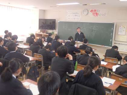 1年生の授業の様子です。学年末考査が終わり、テスト返却が始まっています。テストの振り返りもしっかり行いましょう。また、校庭では体育の授業でサッカーを行っています。けがに気を付けて積極的に活動しましょう。(田村真)