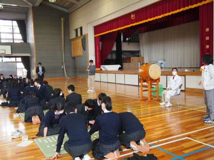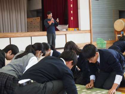 体育館では2年生が百人一首大会を行いました。畳をはさんで、同じクラスの生徒が2人から3人組になり、他のクラスの生徒と対戦します。フナキボ生のすばらしいところは対戦マナーのよさ。途中からあきらめてふざけたり、他の人のじゃまをする、などということは一切なく、「読み手代わります」という先生の声がかかると、一斉に拍手がおこります。