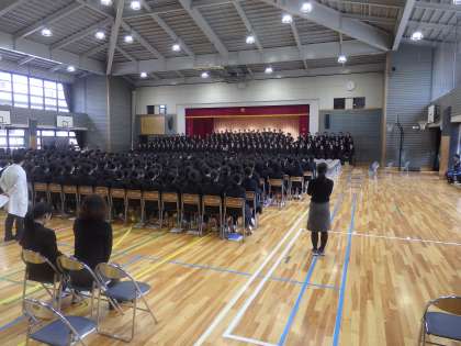 ひな壇に上がった3年生の態度や歌声はすばらしいです。(田村真)