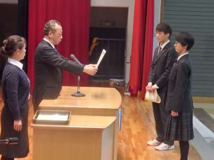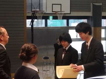 卒業式予行後、3年生の「体育優良生徒」と「東京都産業教育振興会より優良卒業生」の表彰を行いました。体育優良生徒は3年間を通して、体育・スポーツ活動において活躍し、学業にも一生懸命取り組み、他の生徒の模範となり、成果を上げた生徒に対して授与される賞です。東京都産業教育振興会からの優良卒業生の表彰は在学中に、技術・家庭科の学習や実験・実習に積極的に取り組み、卒業後の進路においても、目的をもって意欲的に取り組んでいる生徒に授与される賞です。受賞者のみなさん、おめでとうございます。(田村真)