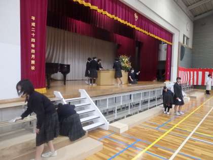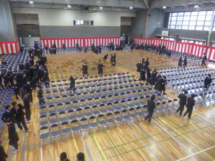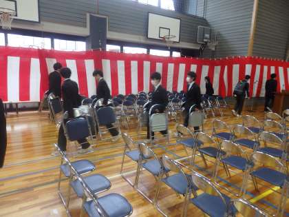 体育館では2年生が卒業式の式場準備をしています。一人一人が自分の役割に責任をもって取り組んでいます。明日の式本番もよろしくお願いします。(田村真)