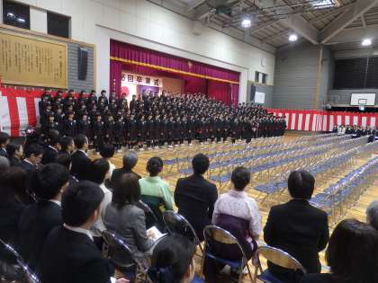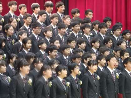 いよいよ3年生が登壇し、別れのことばが始まりました。1年生や2年生の頃の行事などの思い出、感謝の気持ち、言葉だけではなく一人一人の姿からも卒業生としての強い決意を感じることができます。「行こうふたたび」の合唱はさすが3年生、技術以上に魂を感じる歌声です。(田村真)