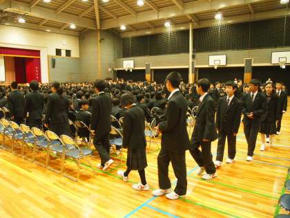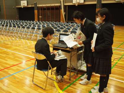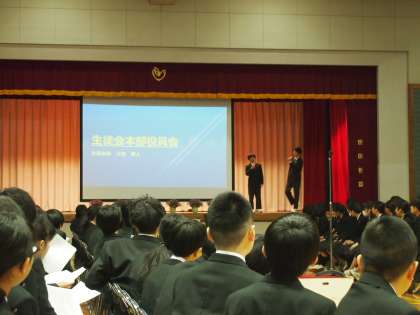 入学式から一夜明けた本日1校時、2、3年生が1年生をやさしく迎え入れる「対面式」が行われました。生徒会と各委員会の紹介をパワーポイントを使って分かりやすく紹介します。しかも、スクリーンの横では、まるで‘漫才のかけあい’のように絶妙な司会進行のもとに進むところは、さすがフナキボ生徒会です。それには、昨年度からの地道な活動と、入念な準備が欠かせません。