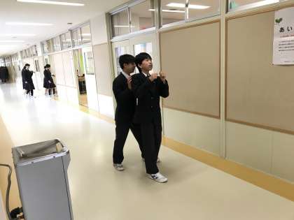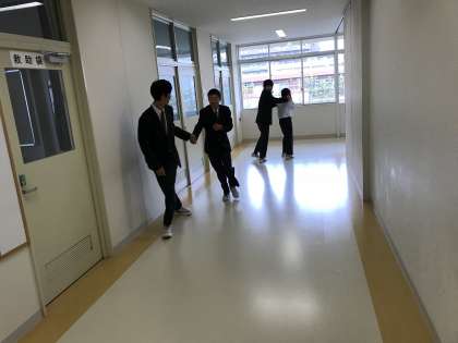 これは、ブラインドウォークを行なっているところです。 ペアになり、1人が眼を閉じ、もう一人が声を出さずに校内を案内して歩いています。