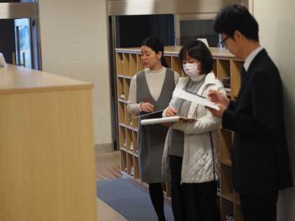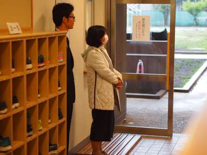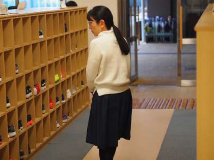 船橋希望中学校では、担任が教室に入る時間、副担任は昇降口にいます。時間ぎりぎりに来た生徒に‘励まし’の声をかけたり、まだ登校していない生徒の確認をしています。「いつも遅刻をしない生徒の上履きがあった」という場合など、すぐ確認の電話を副担任からする時もあります。すべての教員が連携、協力して生徒を支えます。
