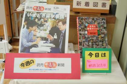 船橋希望中学校の図書室入口には、「今日は〇〇の日」情報があります。その日の内容にちなんだ本や資料が展示してあります。『へ〜そうだったのか〜』『こんな本が図書室にあったのか〜!』という驚きが体験できますよ。