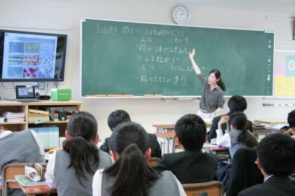 2年生の理科は「細胞のつくりと働き」を学んでいます。着色した細胞を顕微鏡でみた画像をモニターで確認しながら、細胞のつくりについてプリントでまとめています。