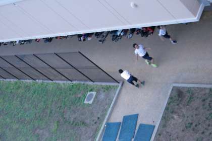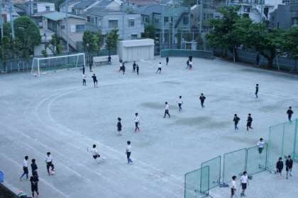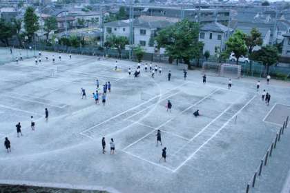 1年生がたくさん入部した船橋希望中の部活では、限られたスペースでいかに全員が体を動かすことができるかがカギとなります。そのために顧問やコーチの指導のもと、練習方法を工夫しています。面談期間の今日も、校庭では硬式テニス部、サッカー部、野球部が活動をしています。サッカー部と硬式テニス部の活動場所の境目には仕切りのネットを置き、相手にボールがあたらないよう工夫をしています。また野球部はボールを使わず、校舎のわきで、盗塁を想定した走り込みをやっています。