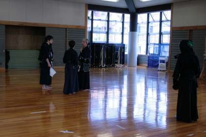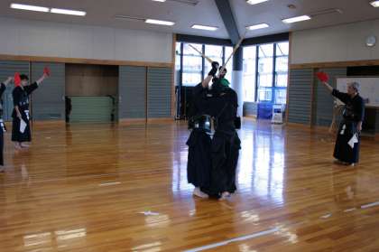 練習試合は対戦している相手同士だけでなく、紅白の旗をもって審判をしている生徒にとっても大切な練習の場です。主審をしているコーチは、時に試合を止めて、反則をとられそうな技について副審の生徒にも状況を説明、当人同士だけでなく見ている生徒にも具体的に注意を喚起します。