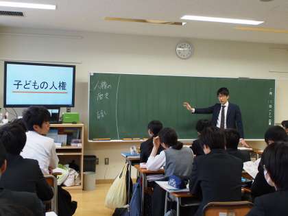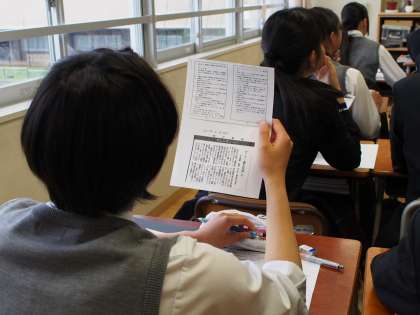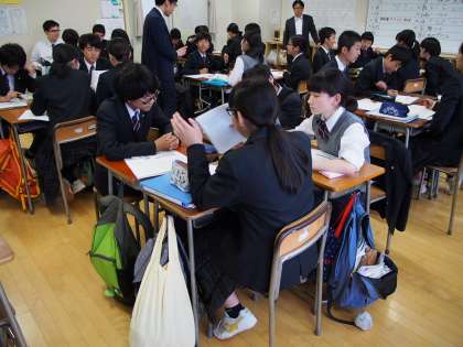 「人権と日本国憲法」では、子どもの人権について、最も身近な校則を題材に考えてみました。人権の歴史をひととおり復習した後、船橋希望中の校則と新聞の投書欄に載っていた意見を読み「校則はいる?いらない」で4人グル-プで話し合いをしました。さすがフナキボの3年生。すべてのグル-プで議論白熱!しかも、自分とは異なる意見をしっかりノートにメモをしています。最後は昨日の新聞に載っていた世田谷長の制服に対する意見文を読み、次回の授業に向け更に考えを深めていました。