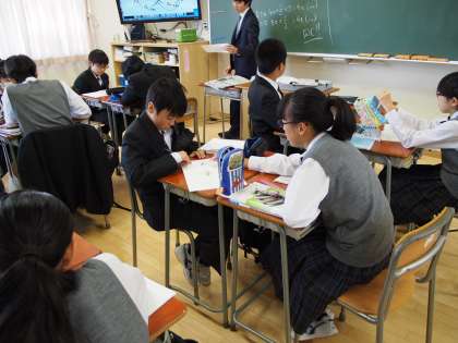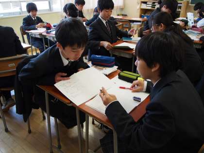 このクラスでは、電子黒板で説明を受けたあと、自分の考えを向き合った生徒同士が説明し合います。相手にわかるように説明することで、より一層自分の考えが深まります。