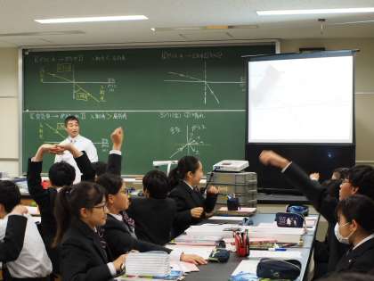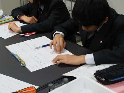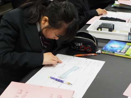 光の性質について勉強しています。前時に学んだ入射角と屈折角について図に描いて確かめます。間違えを防ぐため‘車輪を使った’法則を教えてもらい、さっそく自分の指で実証していました。
