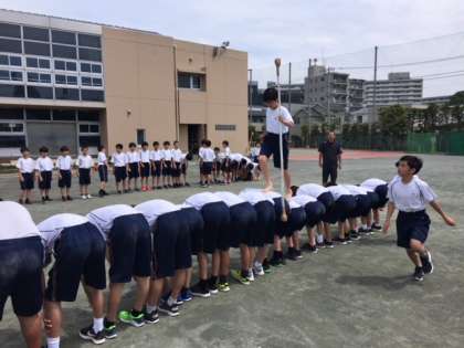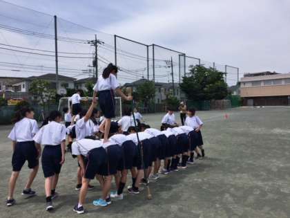 1年生の運動会学年種目である「希船流し」の練習の様子です。まだ練習を始めたばかりにもかかわらず上手に背中の上を渡っています。(大居)