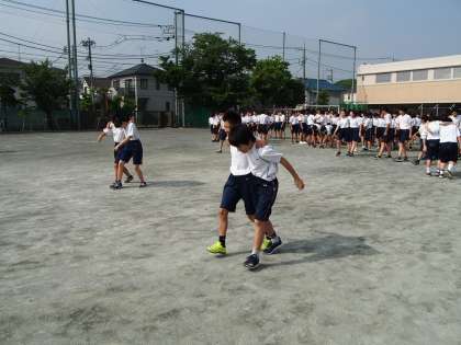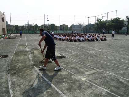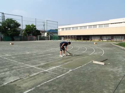 練習している横では、教員が校庭の凹凸をならしています。生徒が全力で走ると、少しの凹凸でもケガにもつながりかねないので、気になるところは補修していきます。