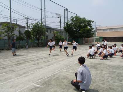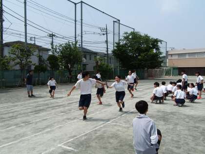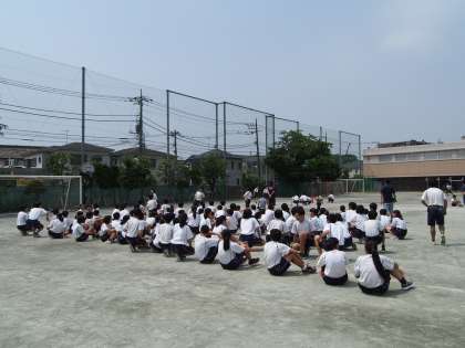 3年生の学年練習です。クラスからの大声援のもと全員リレーの練習をしています。バトンの受け渡しがキーポイントですね。それにしても、声が枯れんばかりの声援を送っているにもかかわらず、次の走者以外全員座って応援しているところがすばらしい。誰かから注意される前にきちんとできる。「さすがフナキボ最上級生!」とエールを送りたくなります。