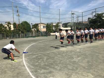 クラス全員が跳ぶので縄の長さがとても長く、縄を回すのがとても大変そうでした。回し手は全身を使って縄を回していました。(伊井)