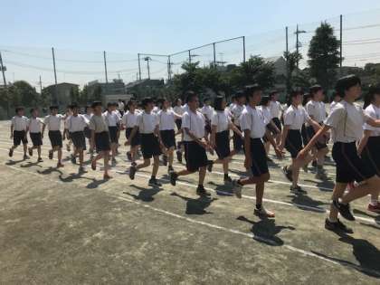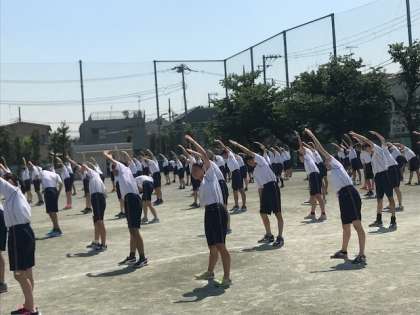 学年練習は体操から始まりました。ラジオ体操や準備体操をしっかり行って、怪我の予防をします。