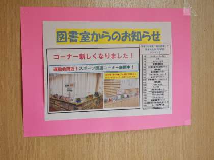 生徒の昇降口に図書室へのお誘いのポスターが掲示してありました。それに連れられて見に行くと、まさに「運動会コーナー」があり、たくさんの関連本が並んでいます。ぜひ、この機会に足を運んでみましょう。