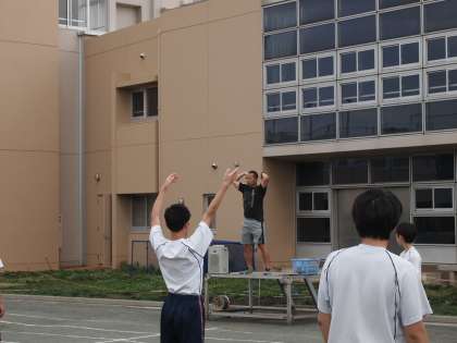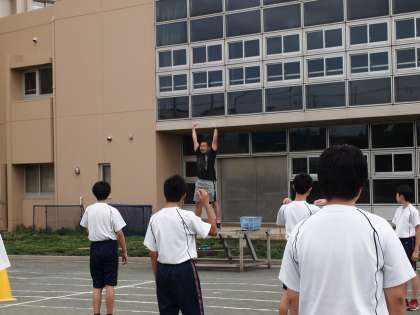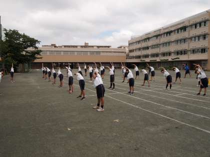 何といっても生徒の関心事は来週の運動会です。当然体育の授業も運動会種目なのですが…。体育科の教員は「プログラム1番はラジオ体操」であることをきちんと意識させ、メリハリのある準備運動を指導しています。教えを受けた後は、指先までピシッと伸びた‘演技’になりました。