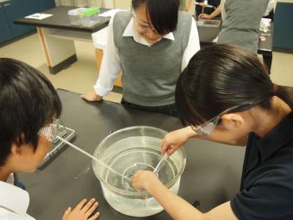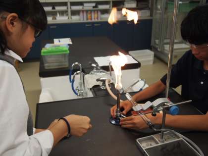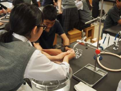 ガスバーナーにマッチで火を付けて実験開始。勢い良く出てきた気体を試験管に集め、最後にリトマス試験紙を入れて成分を確認します。どのグループも興味関心を示しながら、手際よく実験を進めていました。