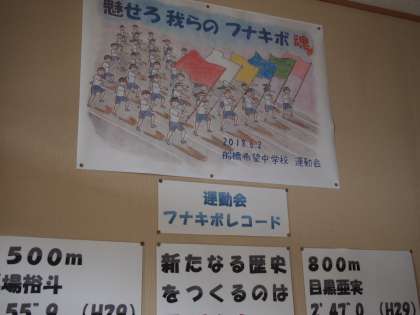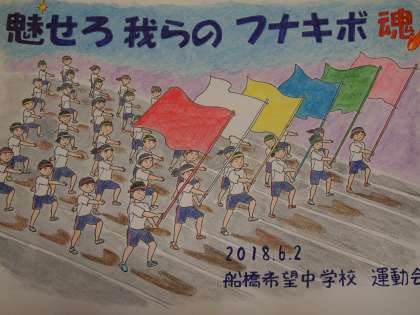 校舎内外の清掃や修繕整備に尽力していただいているエム・ワイ・カンバニーの学校主事さんからイラストをプレゼントしていただきました。「校庭で作業している時、あまりにも生徒さんが頑張っているので、つい描きたくなりました」と3日間で完成させたそうです。校門脇のガラス掲示板と、1、3年昇降口にも掲示してありますので、運動会当日にぜひご覧ください。
