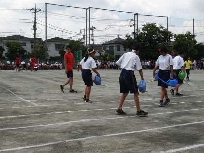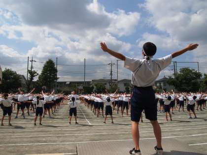 みんなの前で体操をする体育委員はしっかり手先や腕か伸びています。気持ちが体全体に現れていることがわかります。今日のような晴れた日には体だけでなく校庭にも水分補給を忘れずにおこないます。