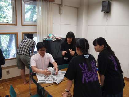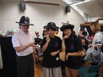 船橋あおばまつりの「工作コーナー」では、ボランティア生徒の手ほどきを受け、小杉副校長先生が帽子づくりに挑戦しました。適切なアドバイスを素直に受けていれて制作に励み、20分ほどで素敵な帽子が完成しました。昨年つくった私の帽子との差は歴然です。