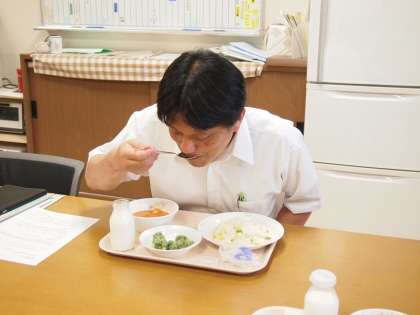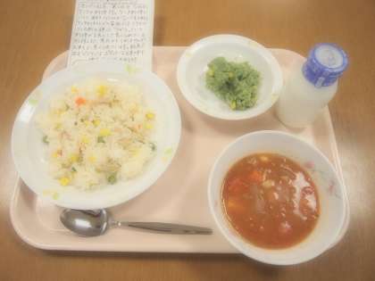 朝の職員打ち合わせで、オリパラ給食の時は、必ず栄養士から紹介があります。『見た目はちょっとギョとする色のムキモですが、口に入れるととてもなめらかな舌触りで美味しいです』との紹介があり、気持ちは高まっていました。実際に食べてみると、期待を裏切らないなめらかさと食感です。副校長先生も大満足。ごちそうさま!