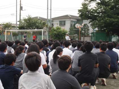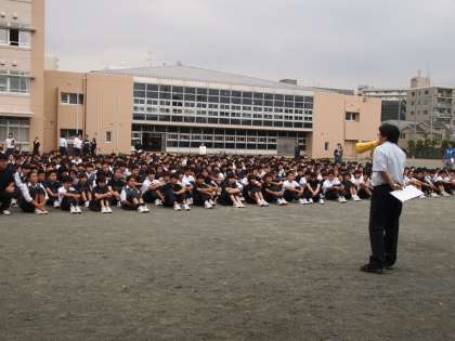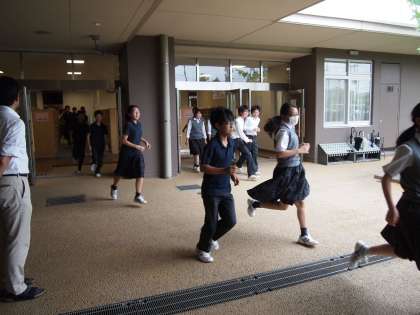 今日の避難訓練は地震を想定して校庭に避難する内容でした。前回の訓練では、校庭に出るまでの話し声が課題でしたが、今日の昇降口では走る足音だけが響いていました。副校長先生の話には、顔をあげてきちんと気持ちも向き合っています。