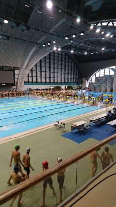 真剣に飛び込みを確認します。 踏切板の調節も、自分たちでやります。(丸本)