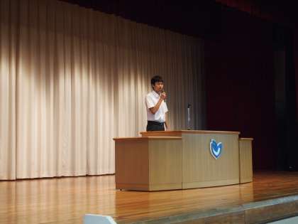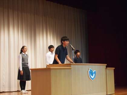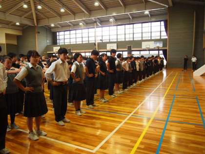 いつものことながら、開始時刻の数分前にはほぼ整列が完了し、体育館全体が静まりかえっています。船橋希望中学校の生徒が自立する気持ちを大切にして、生徒会役員や委員長が呼びかけを行っていることがよくわかる時間です。