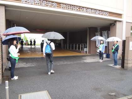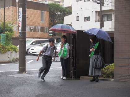 3年3組あいさつ運動最終日は雨が降っています。いつもよりどうしても出足が遅くなりがちですが、保護者の方がやさしくあいさつの声をかけていました。