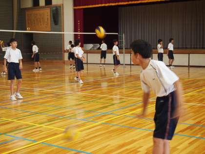 バレーボールに取り組んでいる1年生男子です。体育館に入るとボールを打つ音と共に気持ちのよい挨拶が響いてきます。