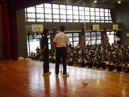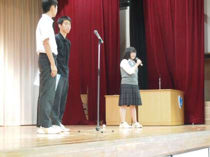 今朝の生徒会朝礼。先月の「今のままだったら生徒会朝礼はなくてもいいのではないか」という目安箱の意見を受け、生徒会役員と委員長の発案で、コント風司会者2人が進行を担当し、その話しの流れを受けて委員長がコメントを言うスタイルに変化しました。生徒からの声を真摯に受け止め、アイデアを出して努力した跡が見られ、フナキボ生徒会の進化を感じました。