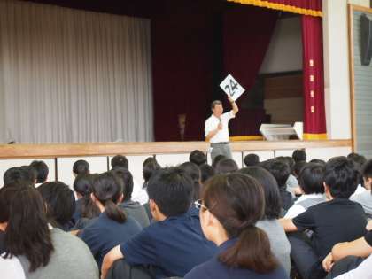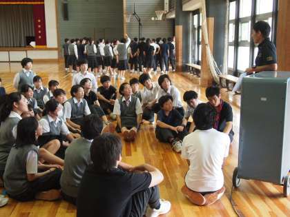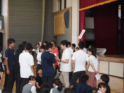 5校時は、集団下校時に備えて、地区班の確認をしました。湿度と気温が高い体育館に全校生徒が集まり、地区班ごとに集まってメンバーの確認をします。こんな環境の中、クラスの枠を離れても、担当教員からの指示を聞く姿勢は、いつものフナキボ生。しっかりと話をしている人の方に顔と気持ちが向いています。