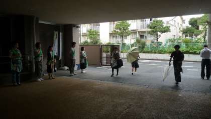 本日12日から3日間、3年6組保護者様による登校時あいさつ運動が行われています。朝早くから、また本日は雨が降る中、ご協力ありがとうございます。(副校長)