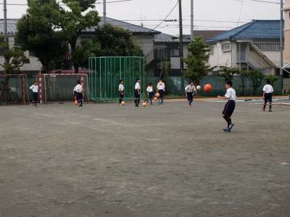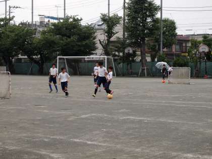 一見すると「夏休み中のサッカー部練習か?と見間違うこの画像は、今朝の朝練習です。弱い雨が時々降っていますが、みんな朝からボールを懸命に追い続けています。