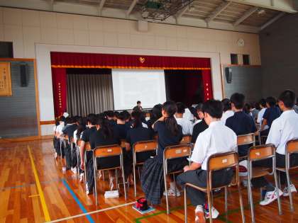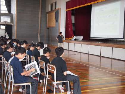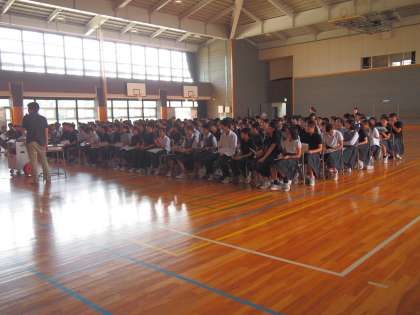 1年生の学年集会では、2学期の移動教室の概要と心構えを学んでいます。5校時の体育館はかなりの暑さです。もちろん窓は全開、大型送風機2台をフルに活躍させてはいますが暑い風が体育館を吹き抜けます。そんな中、生徒は説明に集中し、配られたプリントにもしっかり目を通していました。