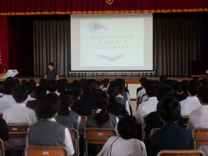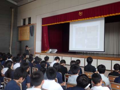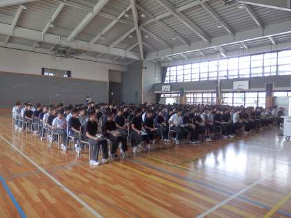 本日5校時、1年生は体育館で移動教室のオリエンテーションを行いました。「信頼される学年に必要な事はなにか?」、「最近の自分達を振り返って思いやりの気持ちは大丈夫か?」などから、1学期を振り返り、移動教室の概要についての説明がありました。生徒達も、話を真剣に聞いており、2学期から本格的に始まる移動教室の取り組みもとても楽しみです。(田村真)