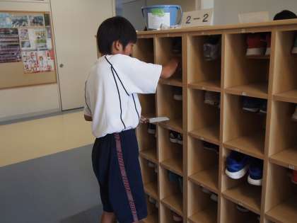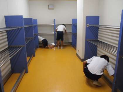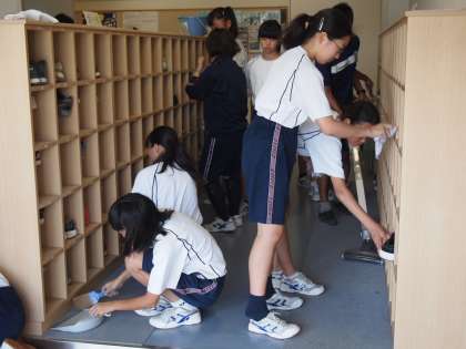 5校時は全校一斉の大掃除。普段の掃除では手が届かない場所にも今日は徹底的に手をいれ、ていねいにかつ‘人海戦術’できれいにしていきます。ここでもフナキボ生は真剣かつ笑顔です。