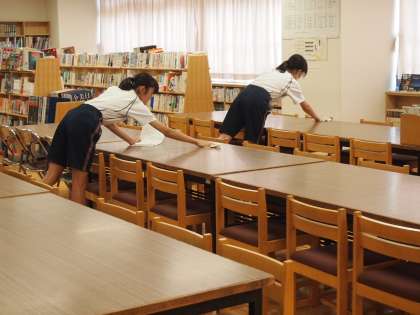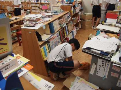 約16000冊の蔵書を抱える図書室は、本でいっぱいです。書棚の上下やカウンターの下など普段は手が届かないところにも手を入れてきれいにしています。この夏休みには初めて小学生にも一部開放することになっています。