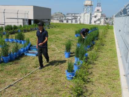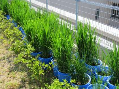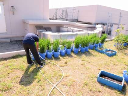 屋上の稲の様子です。今日も3年生の技術係が水やりを1つ1つていねいに行っていました。稲の方もすくすくと育っています。(田村真)